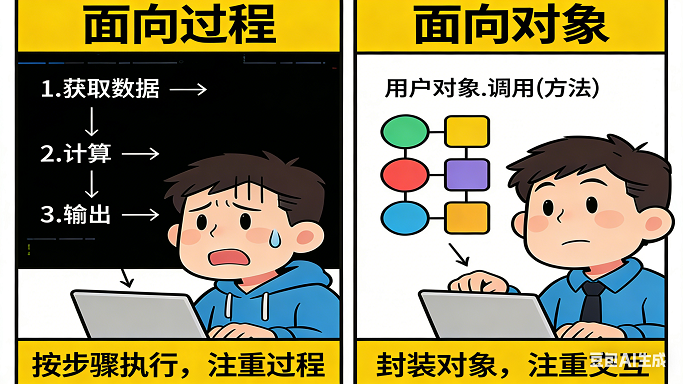 这种思路更有趣!就像班级大扫除,有的同学擦黑板,有的同学扫地,有的同学摆桌椅,大家各司其职。它会给程序里的 “东西”(比如游戏里的角色、软件里的按钮)分好工,让每个 “东西” 自己做好自己的事,特别适合做复杂的软件,比如大型游戏、学习 APP等。而面向对象比面向过程多了一个 “类” 的概念,就像给不同的 “分工小组” 起了名字,方便管理哦。