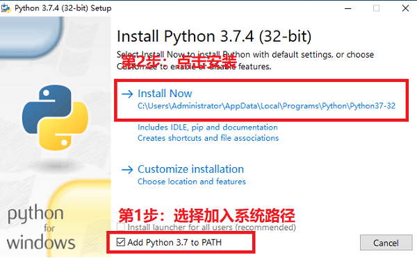 第1步要先勾选把Python的安装目录加入系统路径中,这样是方便以后Python插件的安装和使用。然后就可以直接点击安装了