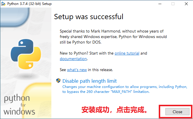 安装过程结束后,你会看到这个界面。这就说明安装成功了。这时你需要点击close即可。