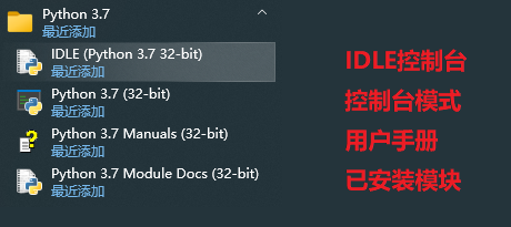 安装完成后,在桌面是没有Python的快捷方式的。你必须点击屏幕左下方的[开始]按钮,打开里面的[Python3.74]标签。这时你就会看到里面包含四个工具选项。