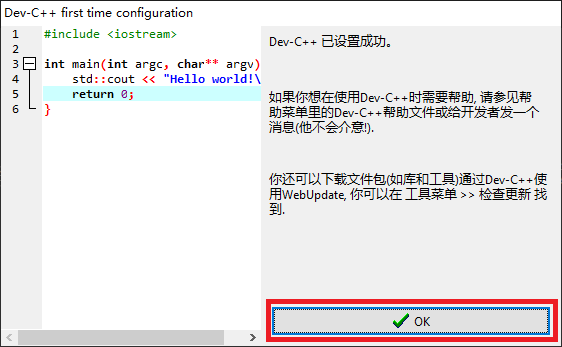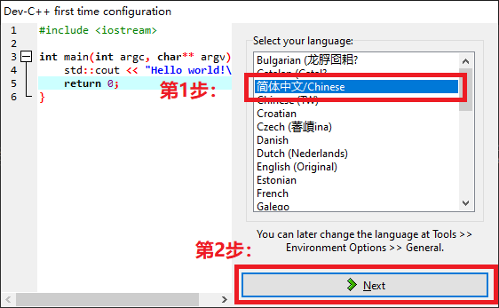第1次运行DevCPP时,会自己进入配置选项。按照下图指示即可完成。