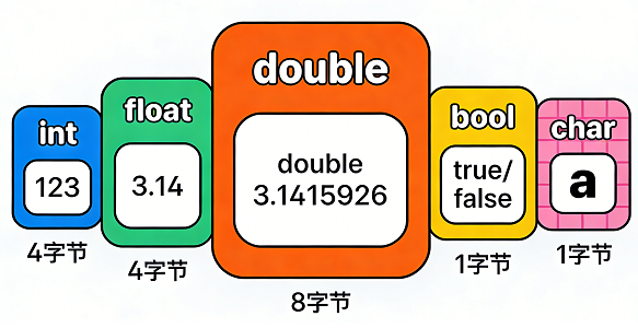在数学中,我们学过整数,小数这些数字概念。在程序设计中也分为:存储整数的整型类型、存储小数的浮点类型。如果你存储的不是数字而是字符信息,就要用字符类型或字符串类型来存储。不同数据类型占用的内存空间大小也是不一样的。下面介绍几种常用的数据类型。