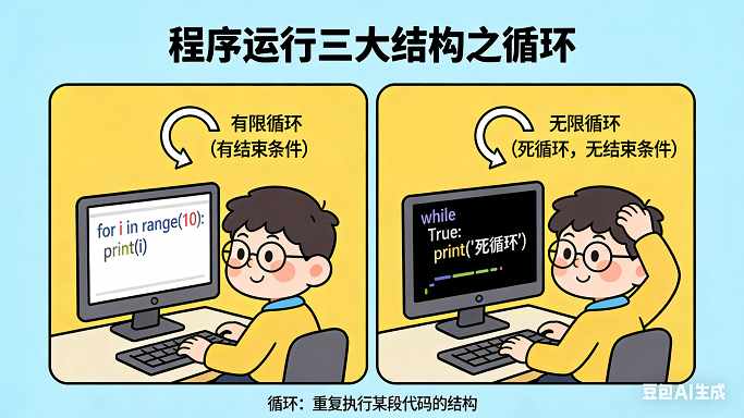 循环就是重复的意思,它是程序运行三大控制结构之一。循环也分为有限循环和无限循环(死循环),它们的区别在于是否存在结束循环的条件。