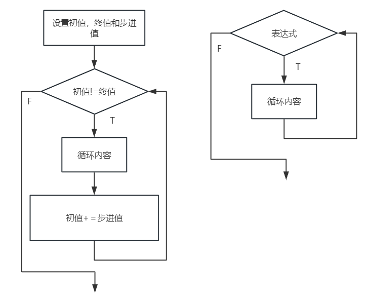 for语句可理解为计数循环。每执行完一次循环,初值变量就会自动加步进值。直到初值==终值。这个过程不需要人为设置。for语句有两种常用的写法: