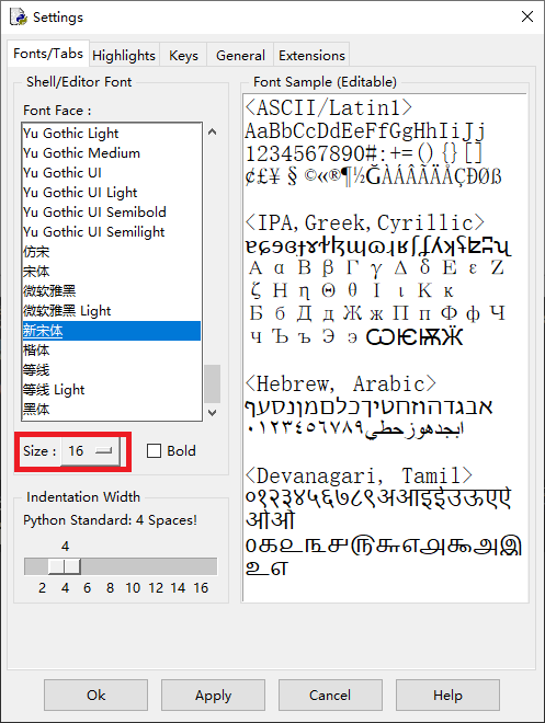 默认情况下,这个编程环境字体较小。我们需要手动设置一下。选择菜单中的Options选择其中的Configure IDLE选项。就可以打开编辑器配置窗口。这里我们只需要将字体大小调整到自己合适的数值即可,我一般字体大小设置16。