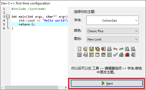 第1次运行DevCPP时,会自己进入配置选项。按照下图指示即可完成。