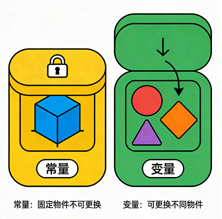 不同的“盒子”存储不同的内容。如果这个“盒子”只能存一件东西,不可再更换,那它就是常量;如果“盒子”里的东西能更换,那它就是变量。