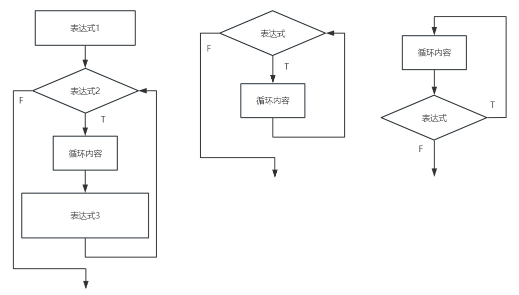 C++的循环语句包含for语句、while语句和do..while语句。for语句和while语句属于先判断再循环。do..while语句属于先循环再判断。下面是它们执行流程图。